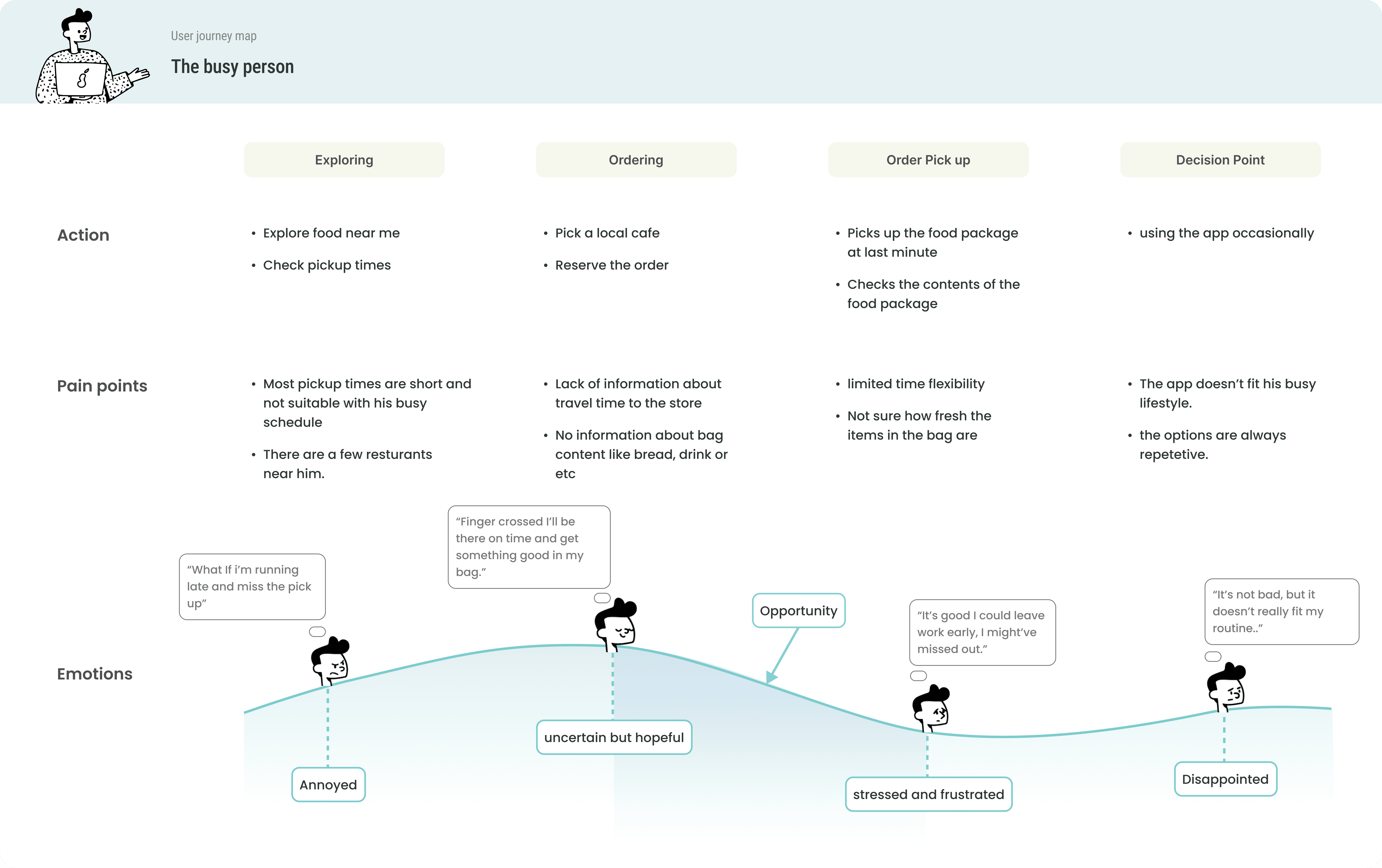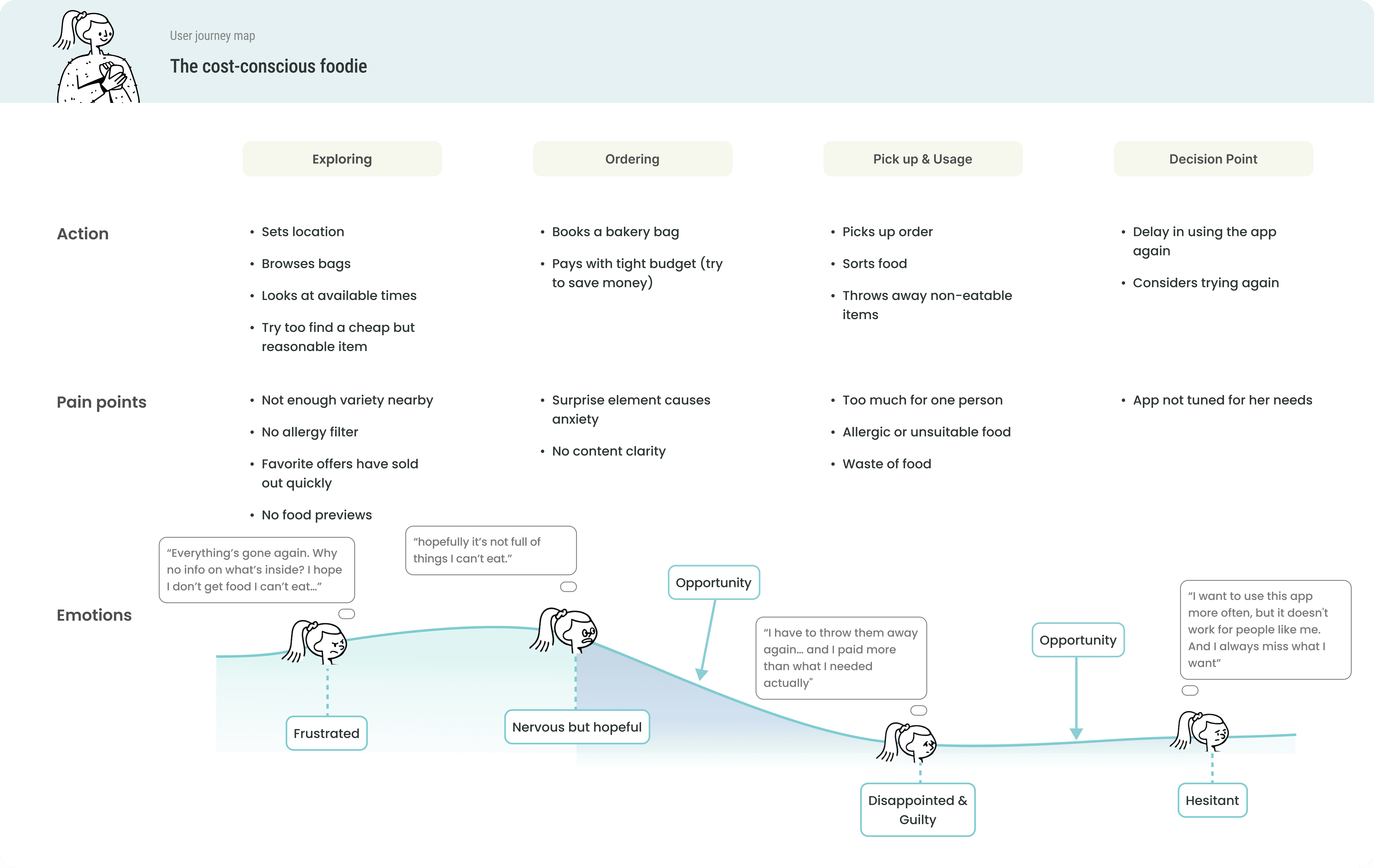 From user feedback, we found several pain points shared in their own words. Users often lose trust and stop using the app when the surprise bag feels unreliable whether it doesn’t match their dietary needs, doesn’t fit their schedule, or lacks expected quality and value.