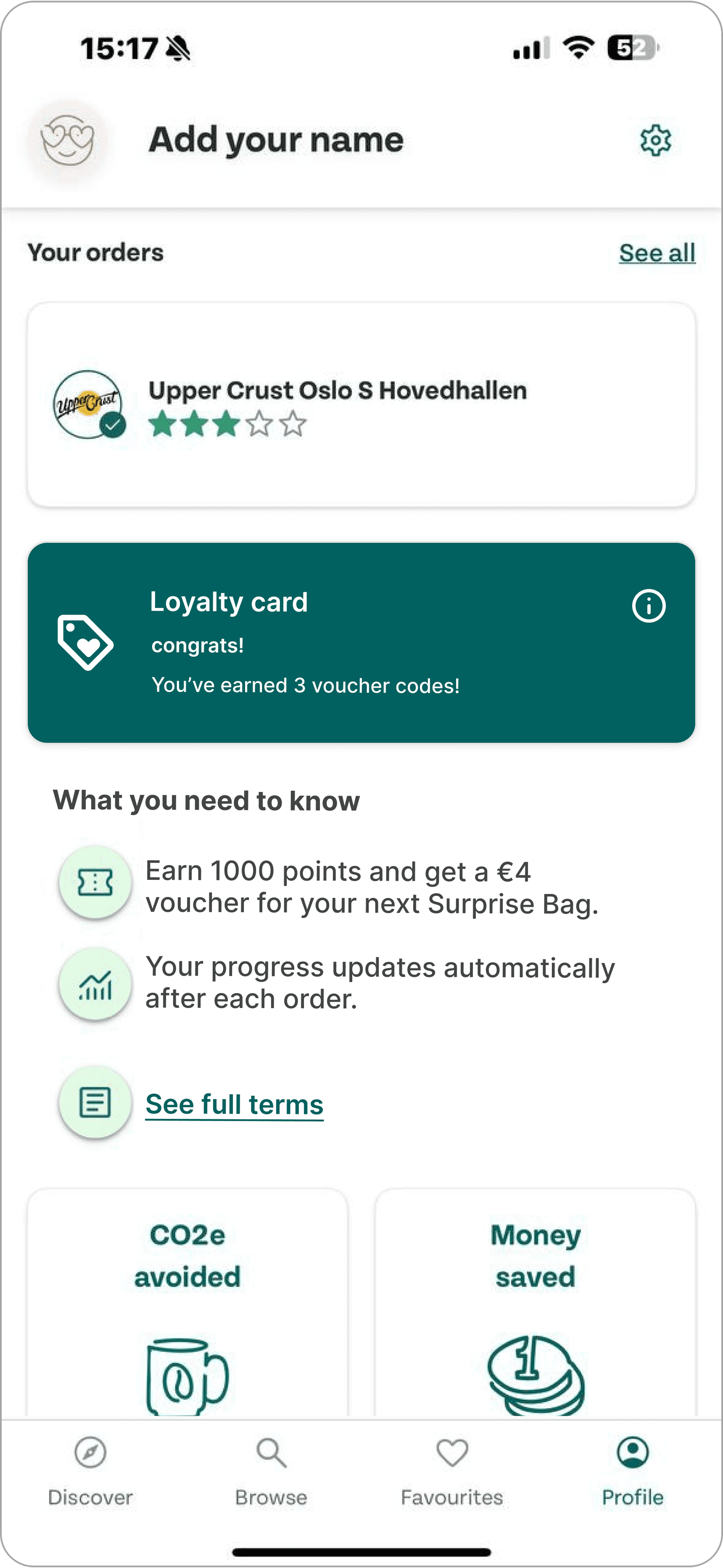 Rewards will be displayed as vouchers in the Loyalty Card section of the profile page.