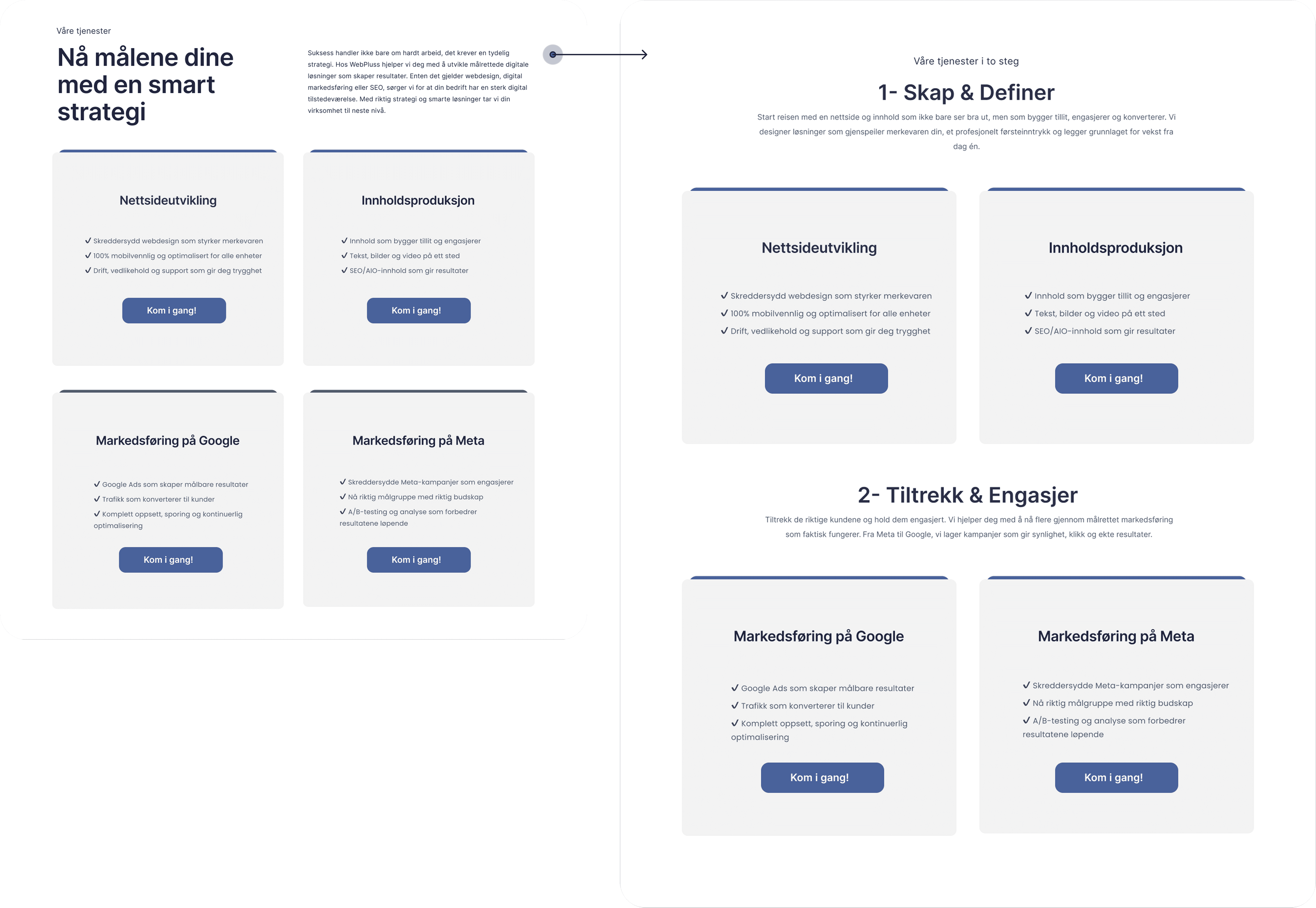 We reorganized the service section into two clear categories with short descriptions, making it easier to scan and helping users quickly understand how WebPluss supports them: “Create & Define” and “Attract & Engage.”